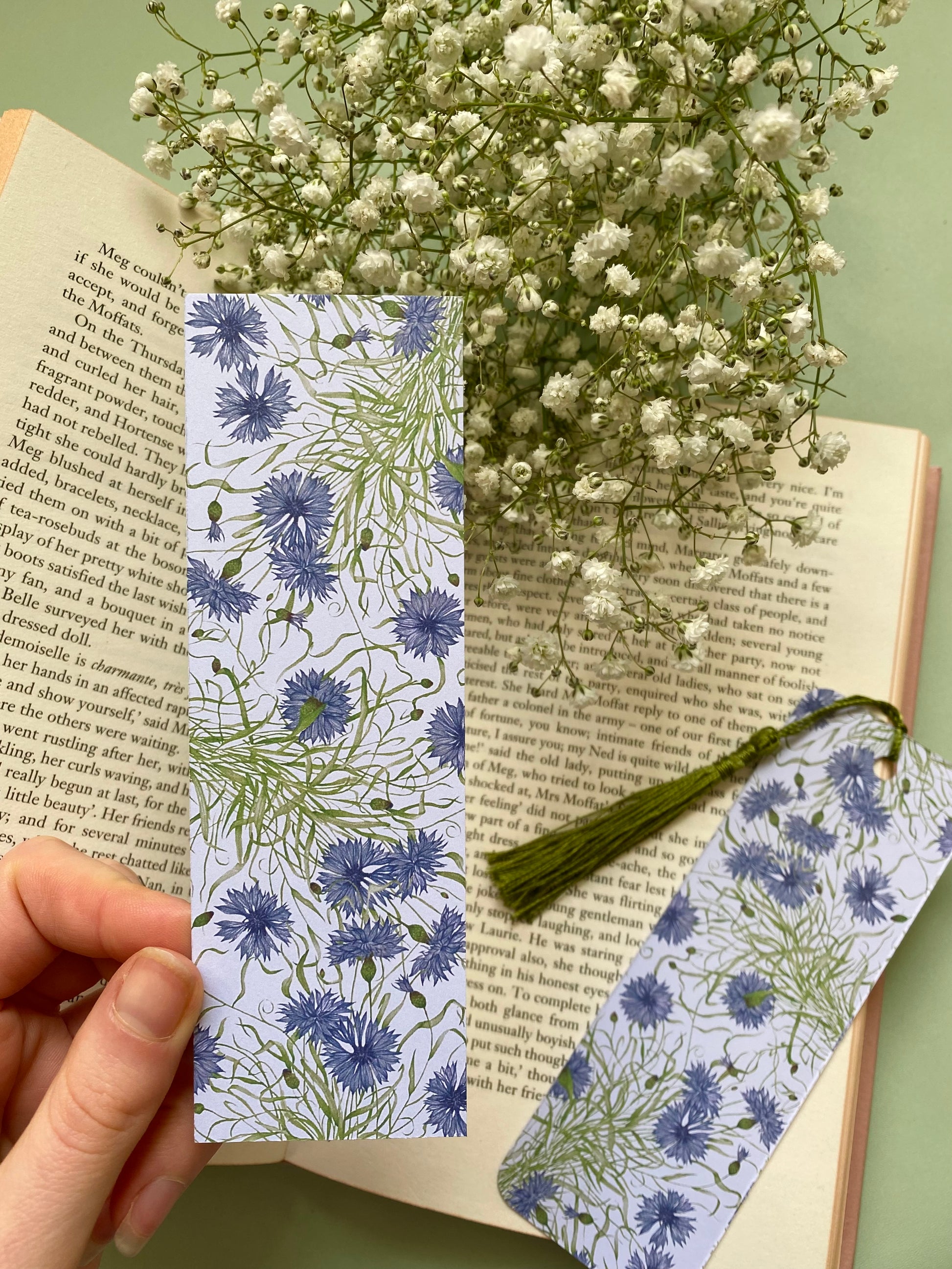 This unique, handmade bookmark features a watercolour print of cornflowers. You can customise your order to create the perfect bookmark: add your choice of satin tassel; decide between square or rounded edges.