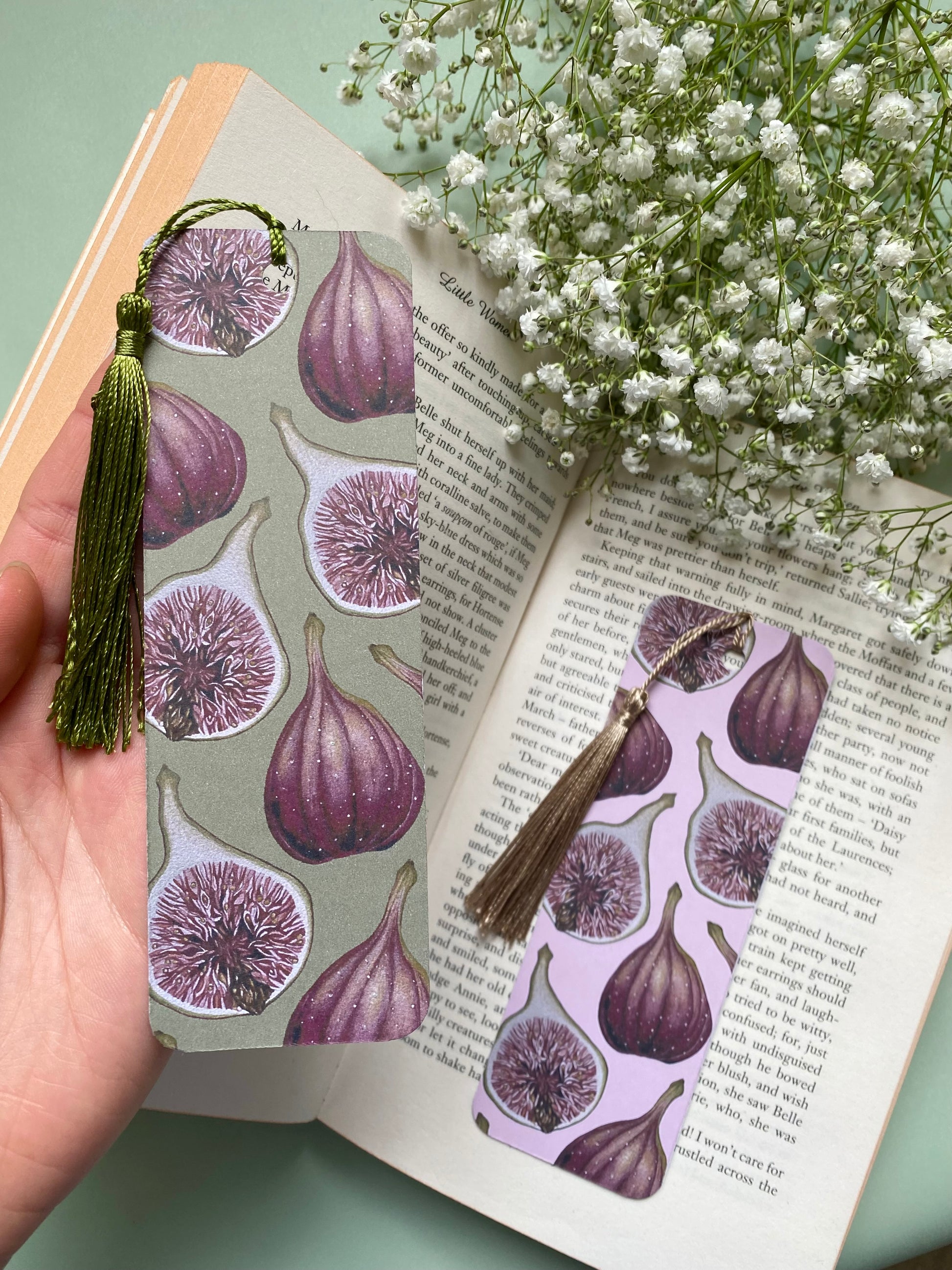 This unique, handmade bookmark features a beautifully-detailed, watercolour print of botanical figs. You can customise your perfect bookmark: add your choice of satin tassel; rounded or square edges; decide between green or pink backgrounds.