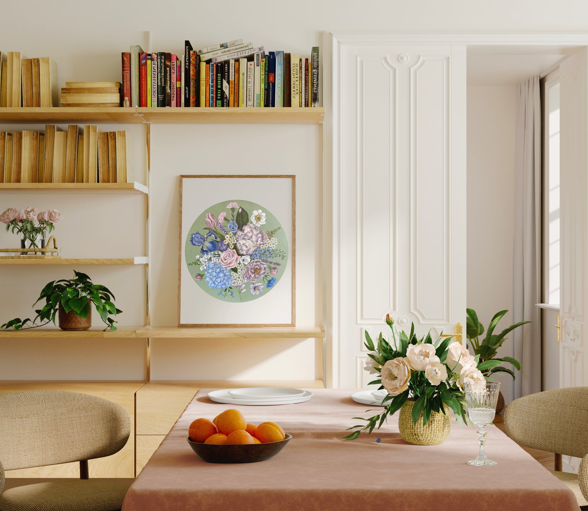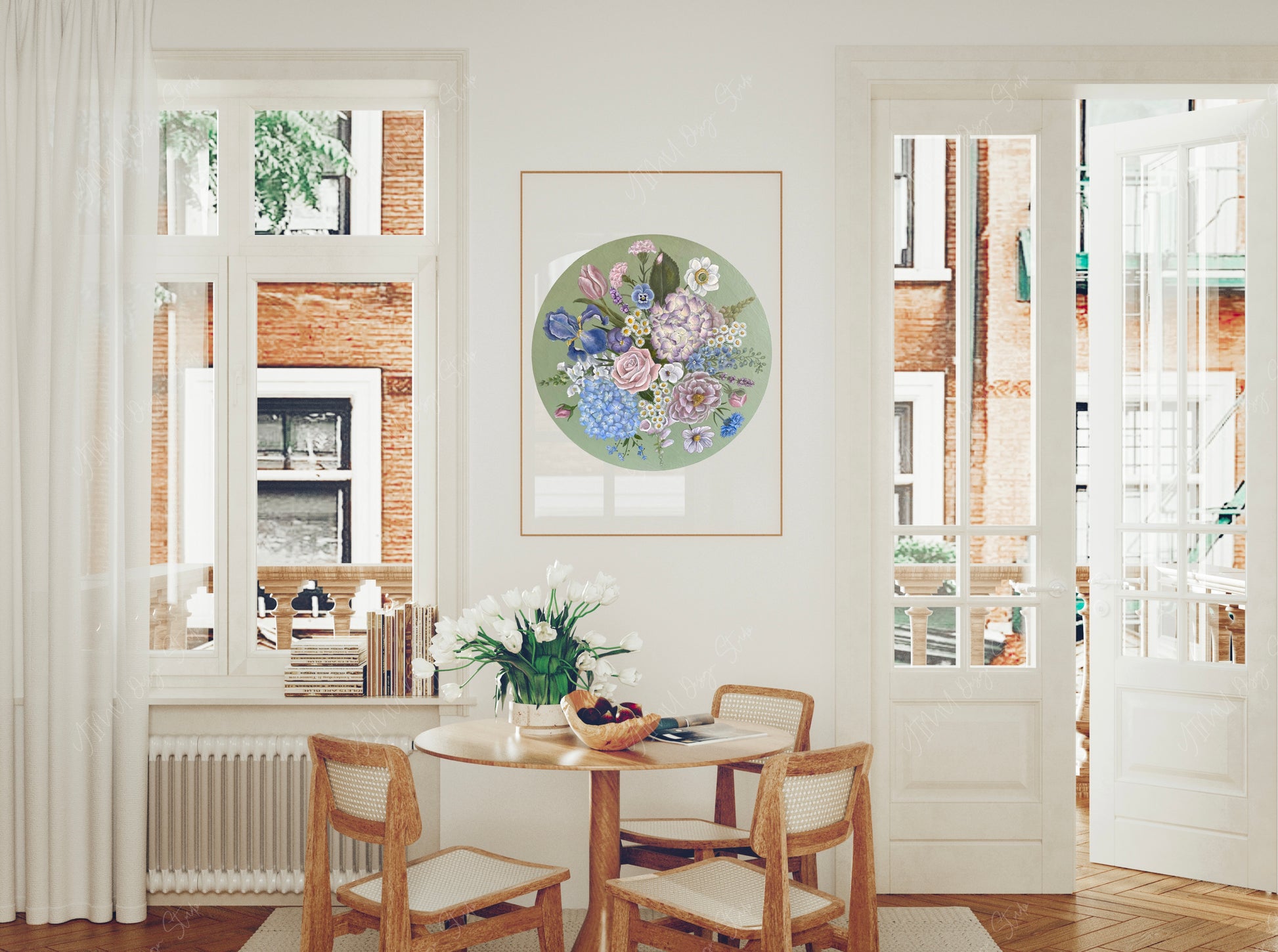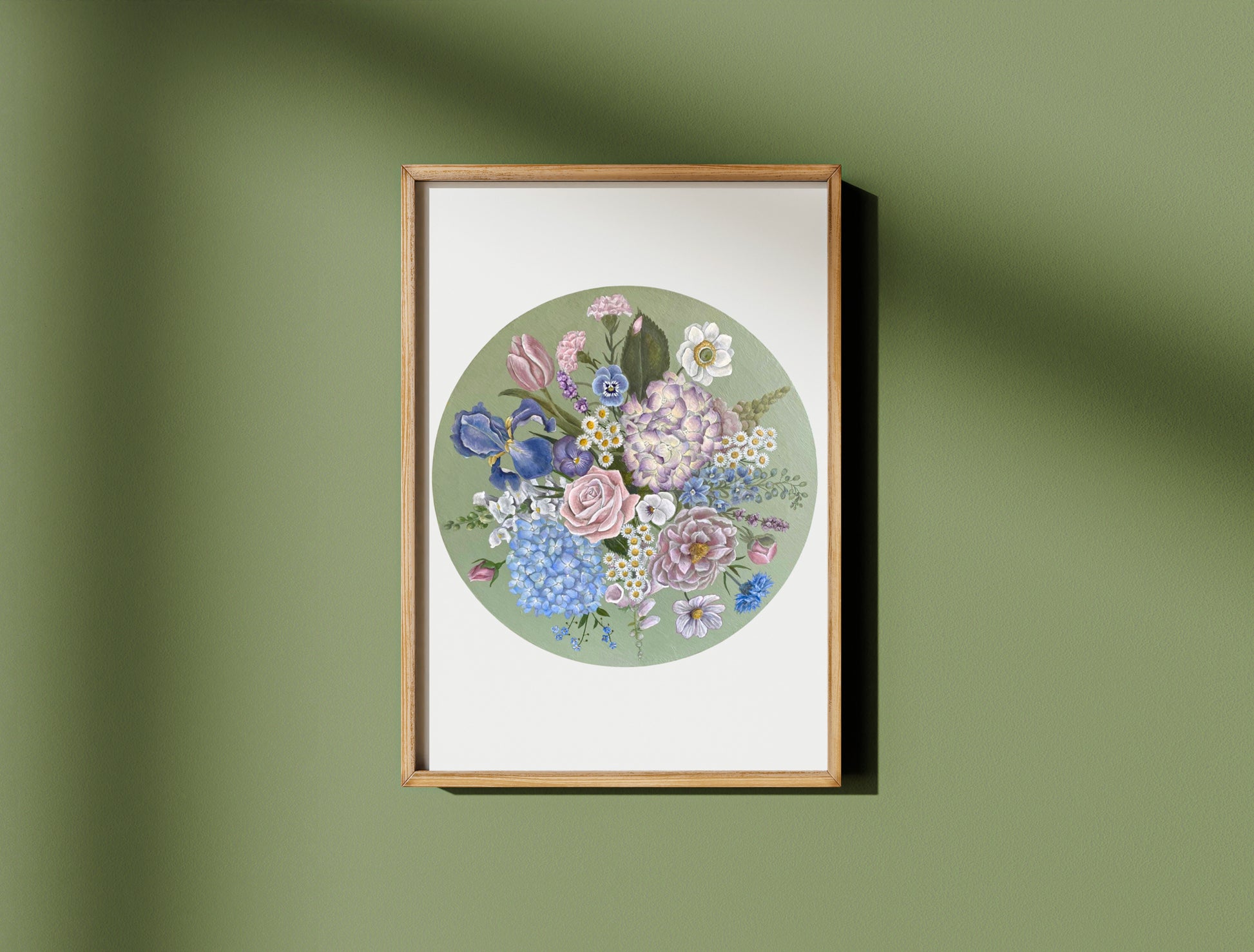 Print! This joyful print features a hand-painted oil painting of a romantic floral bouquet. The original round-canvas oil painting is shown in photo 3.