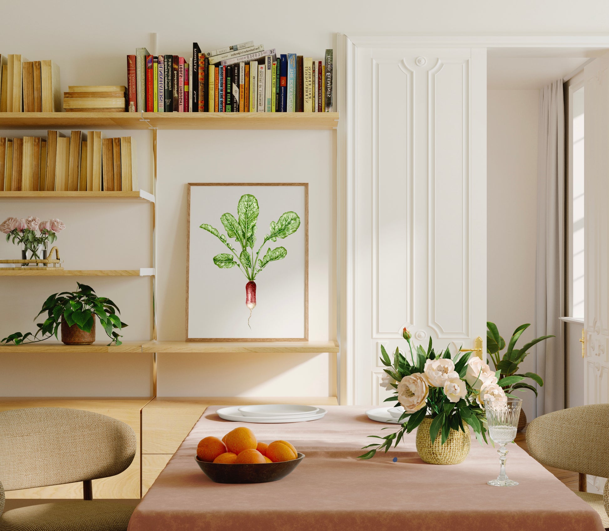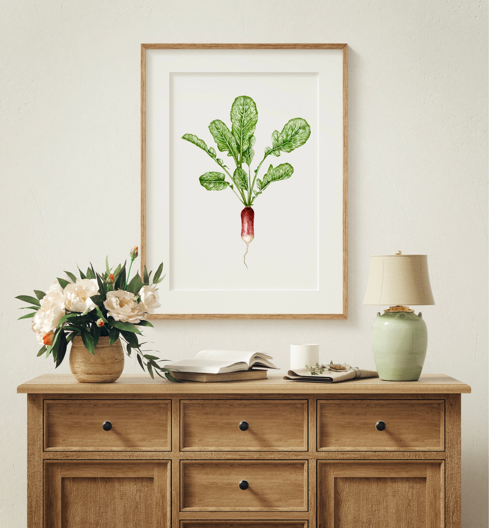 This hand-painted watercolour features beautifully-detailed, botanical illustration of a French breakfast radish.