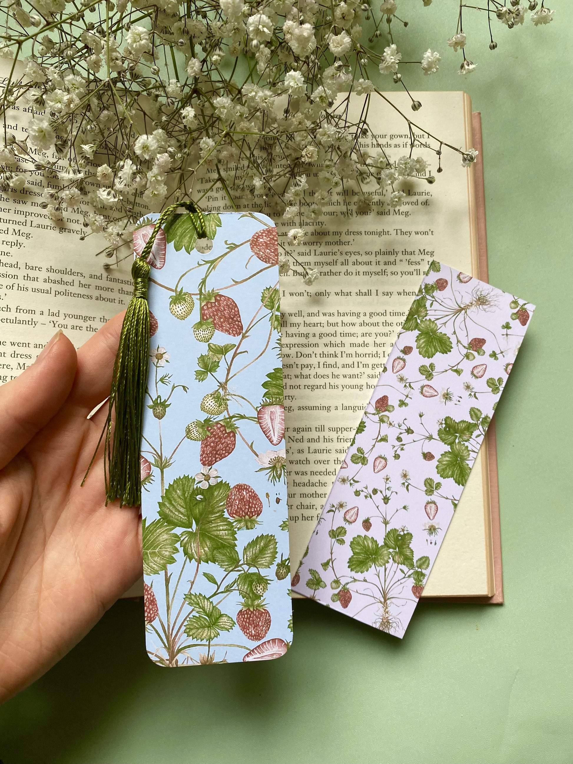 This unique bookmark features a hand-painted watercolour print of strawberry plants. You can customise your perfect bookmark: add your choice of satin tassel; decide between square or rounded edges.