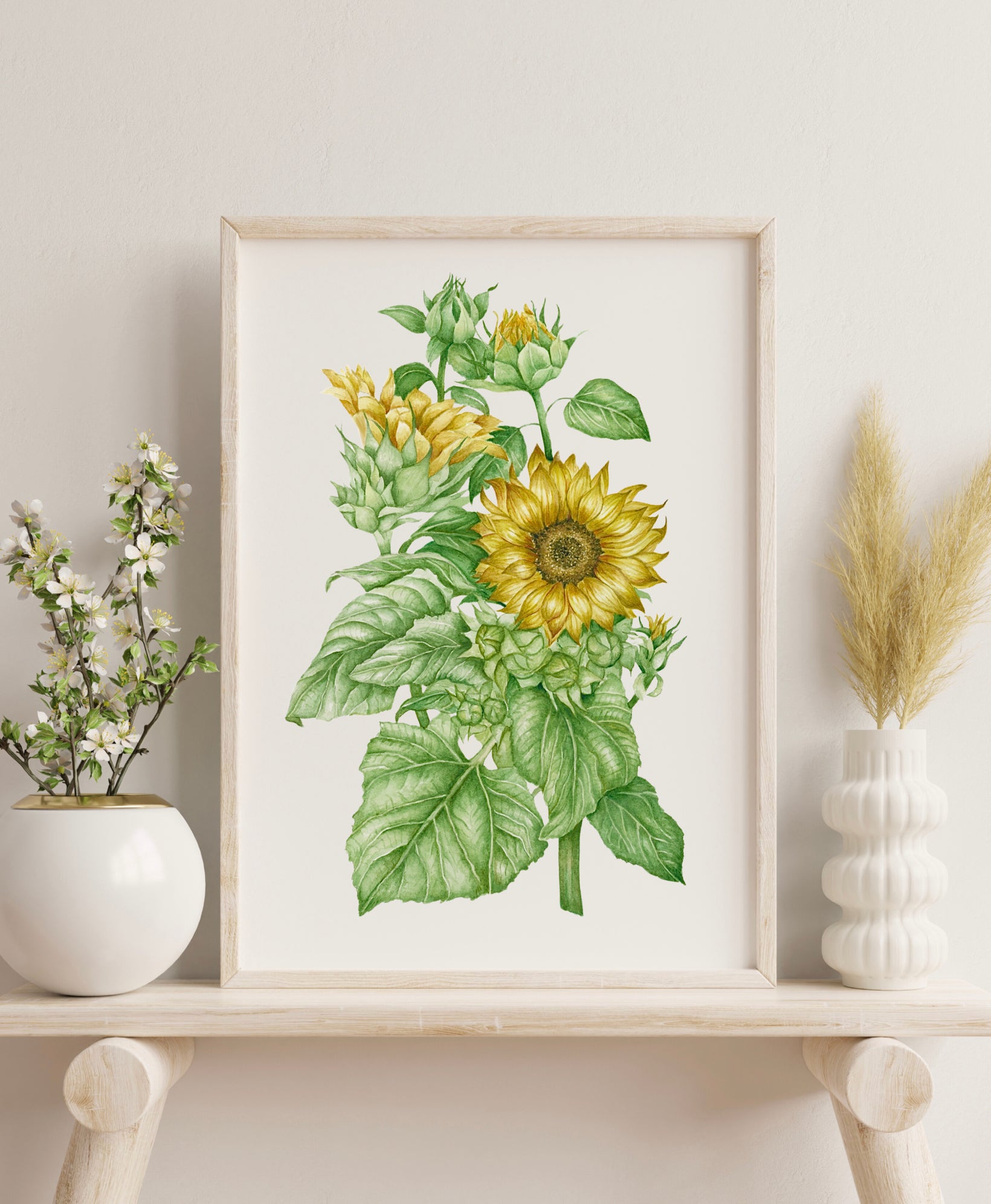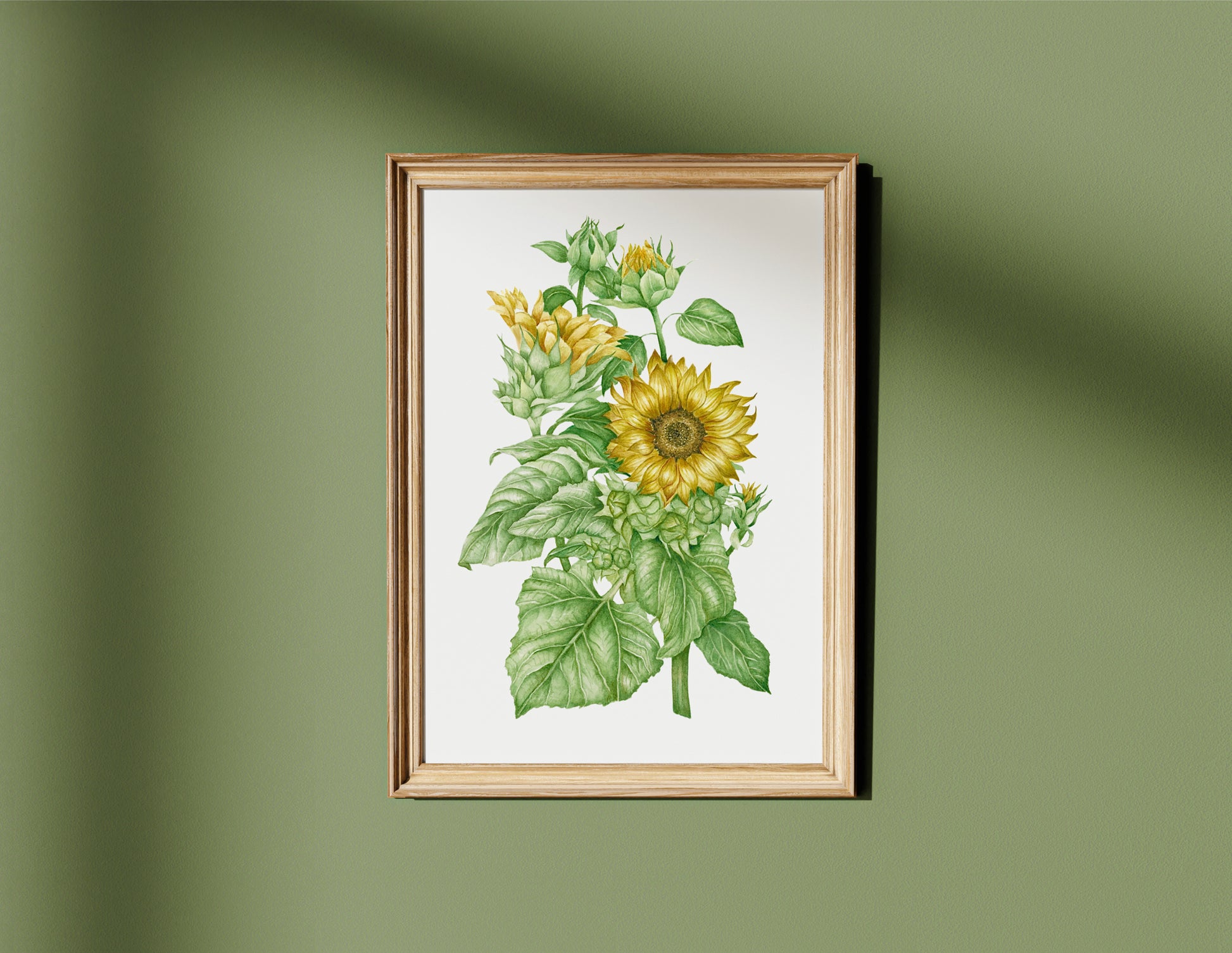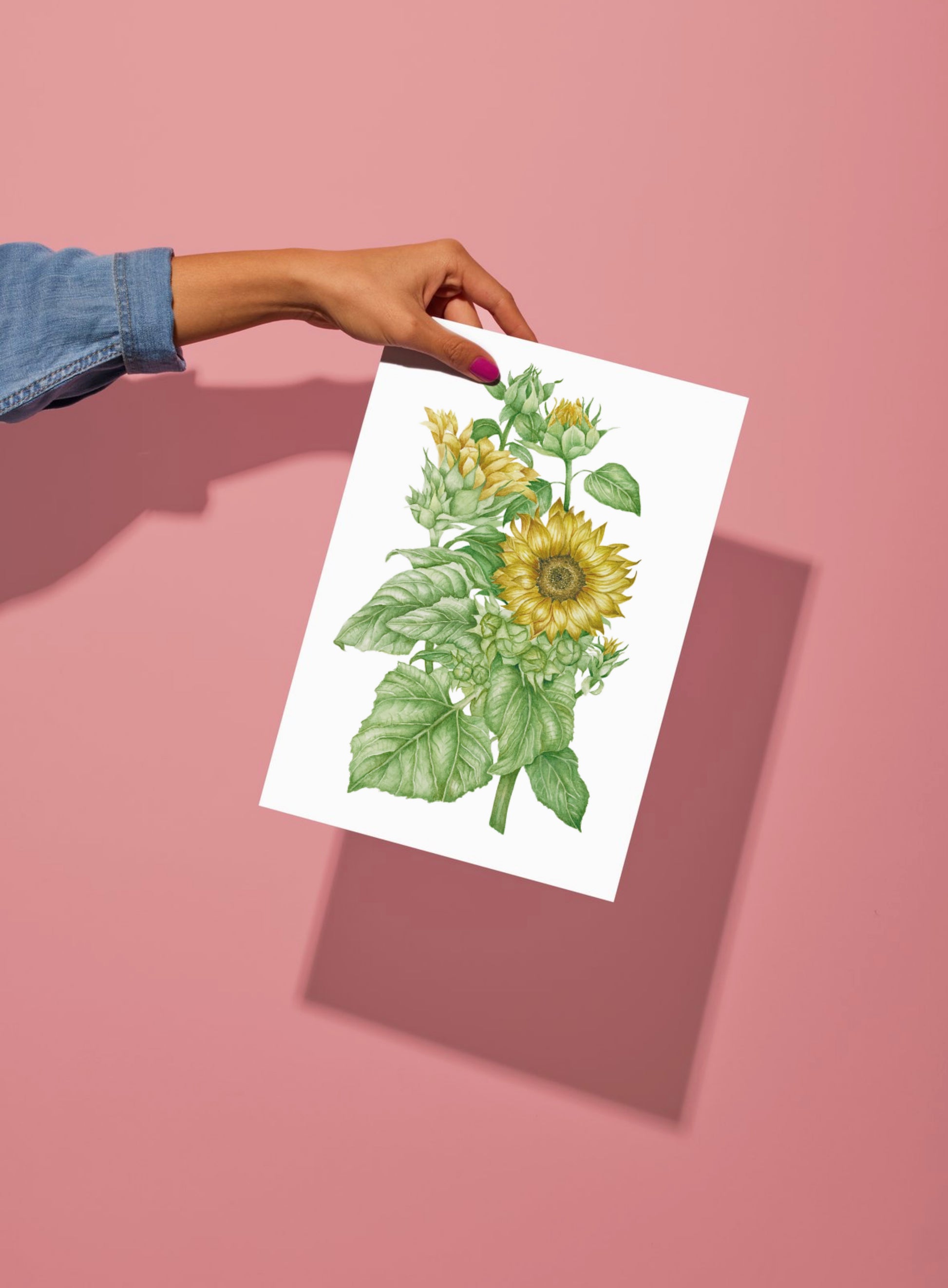 This joyful, botanical print features a hand-painted watercolour of sunflowers.