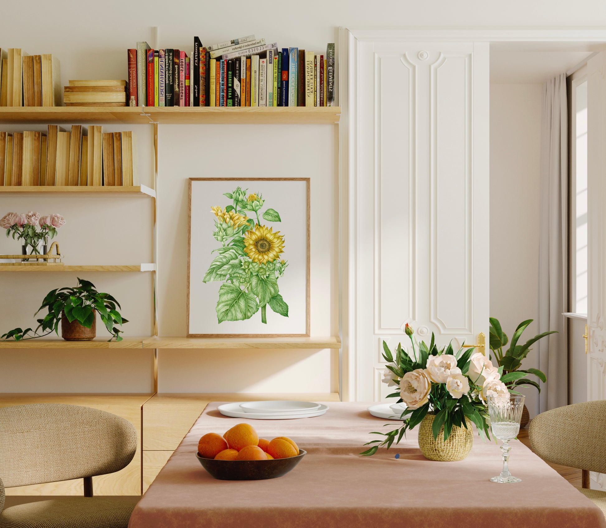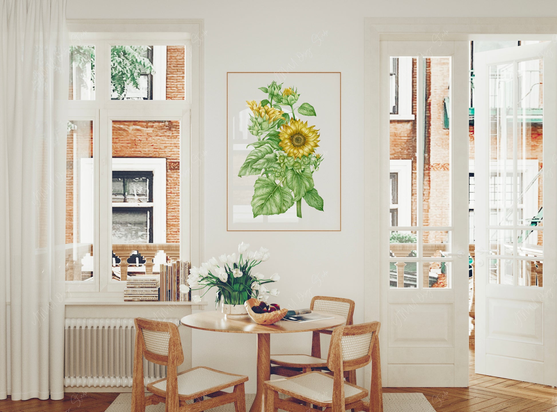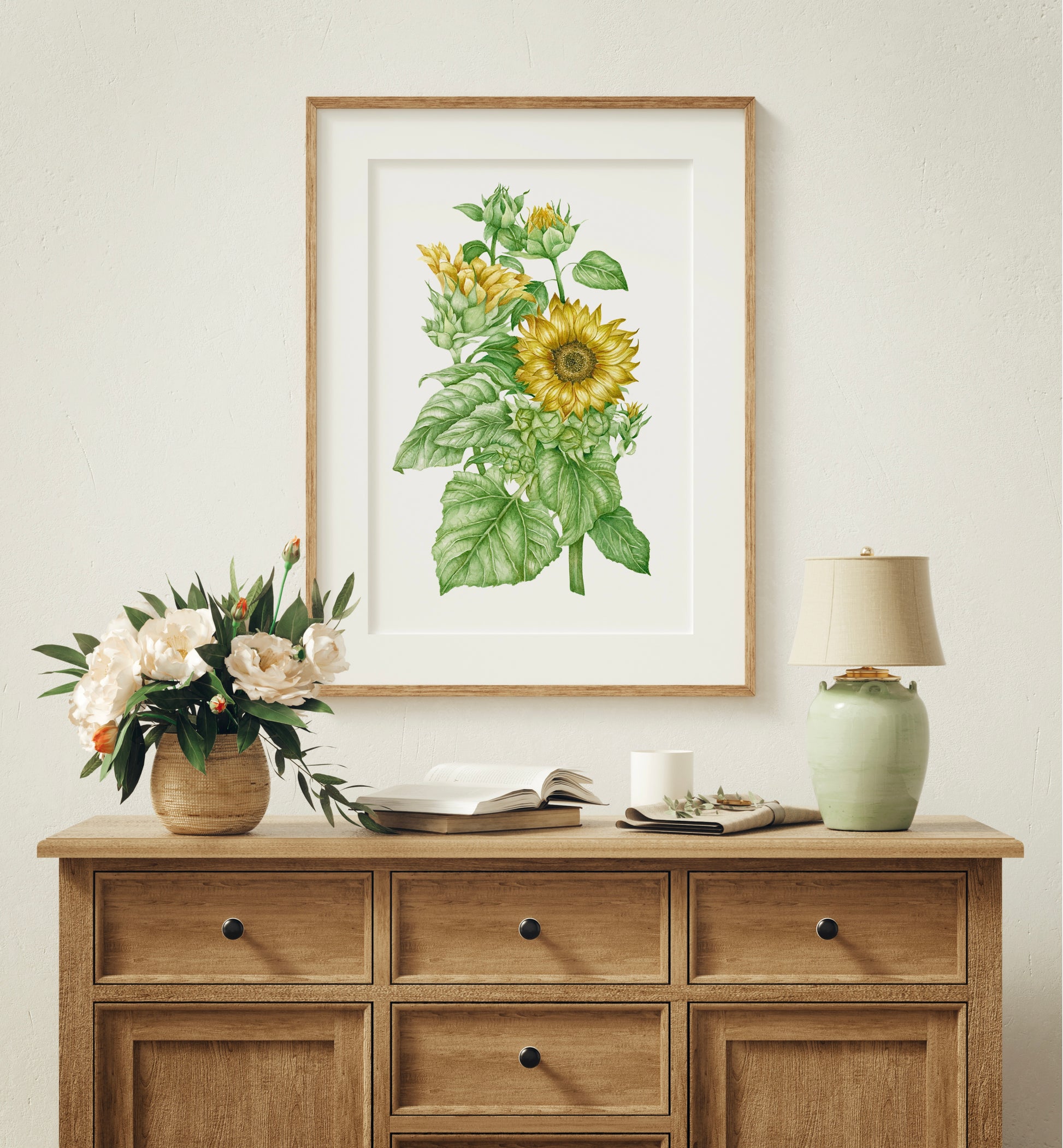 This joyful, botanical print features a hand-painted watercolour of sunflowers.
