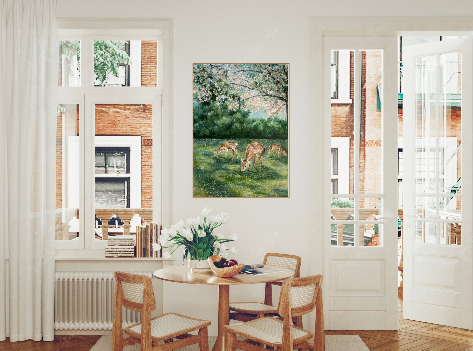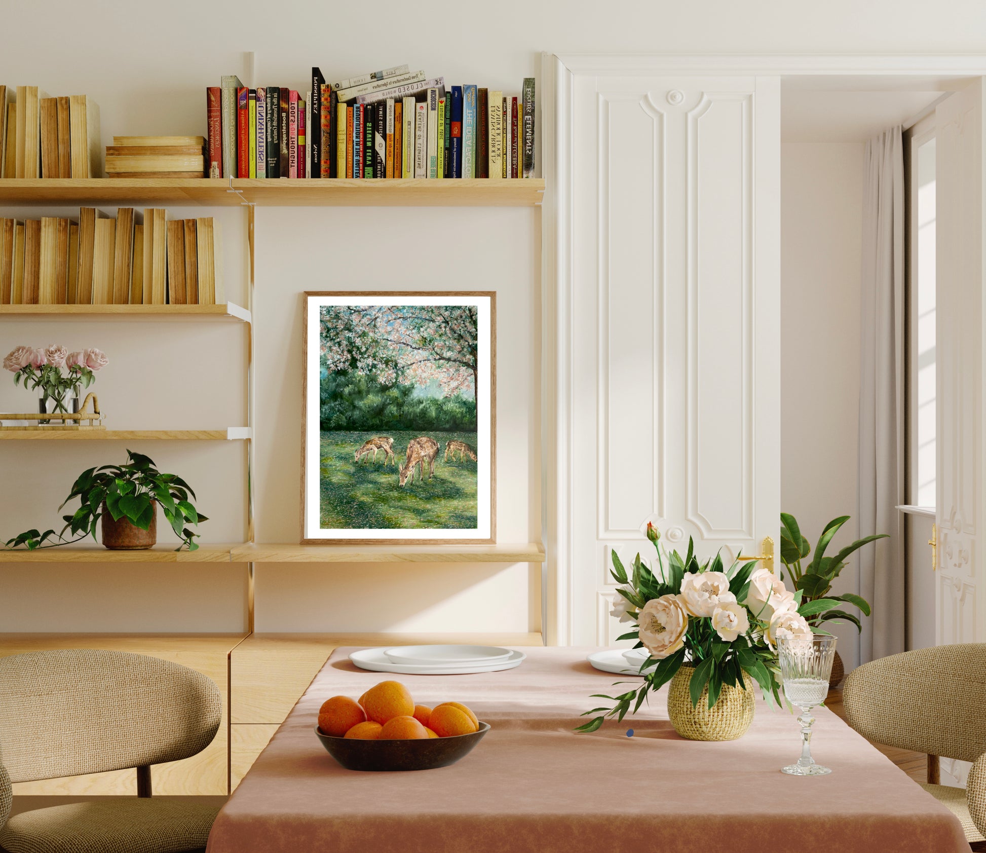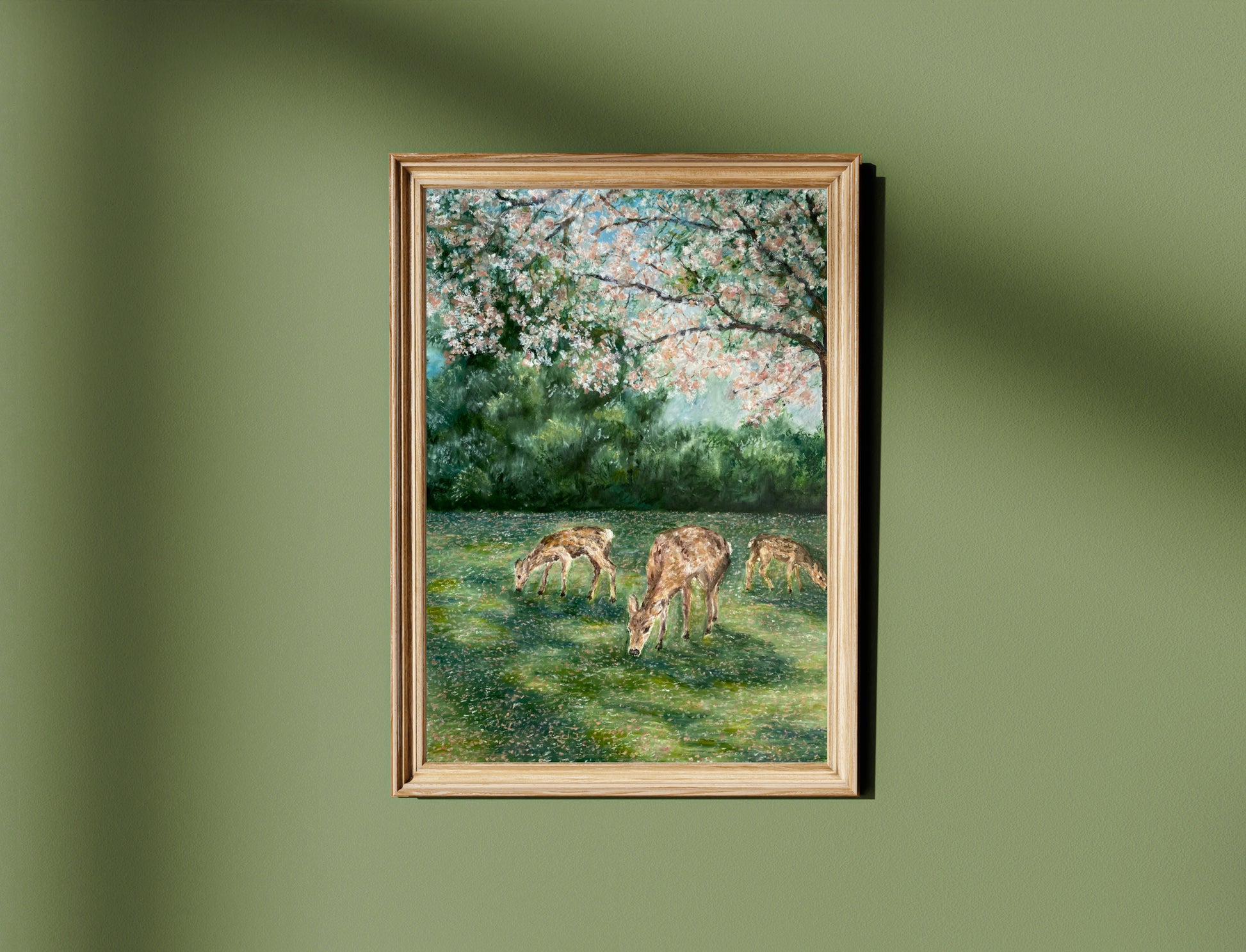 This joyful landscape print features a hand-painted, impressionist oil pastel of deer grazing under a cherry blossom tree.