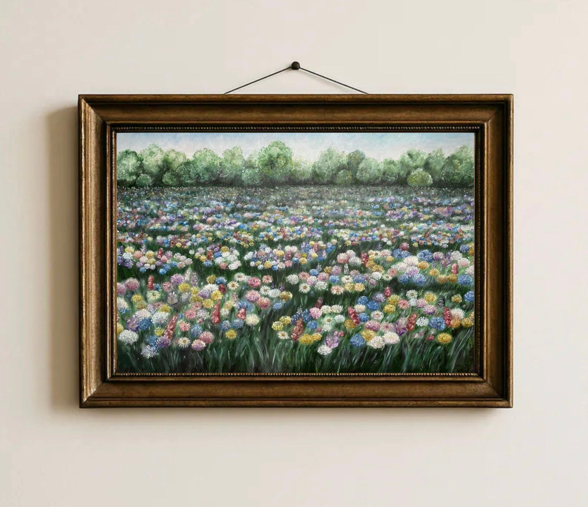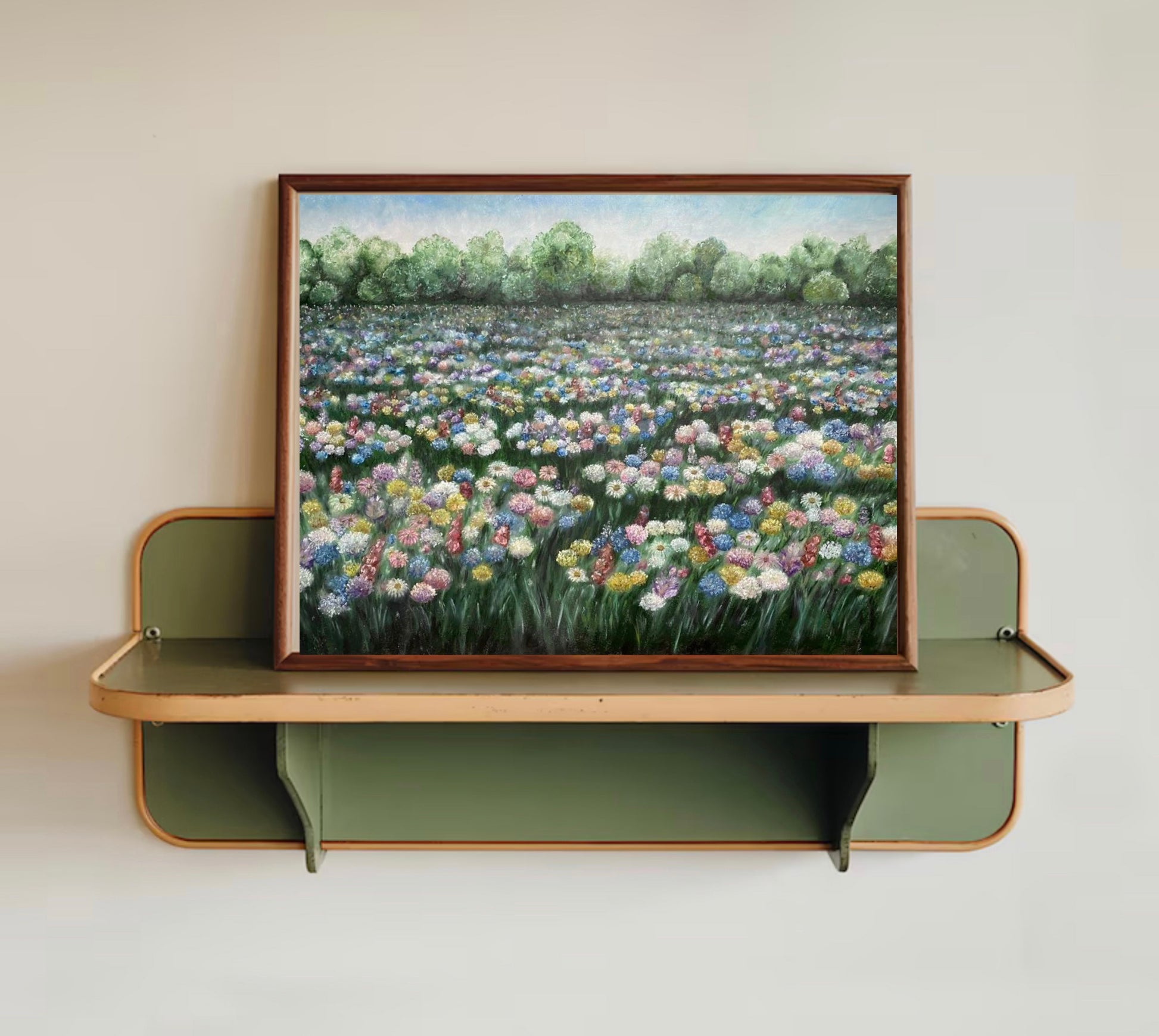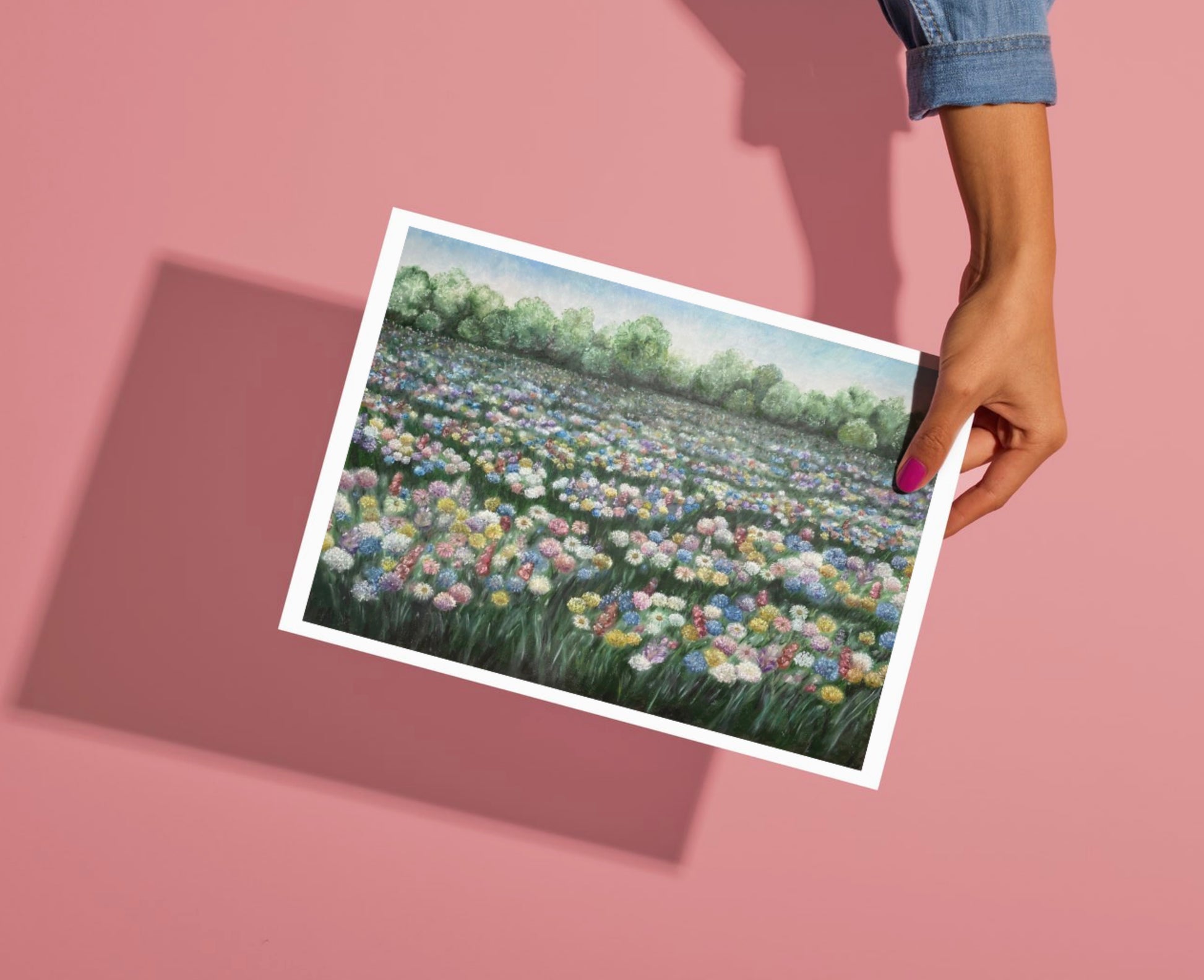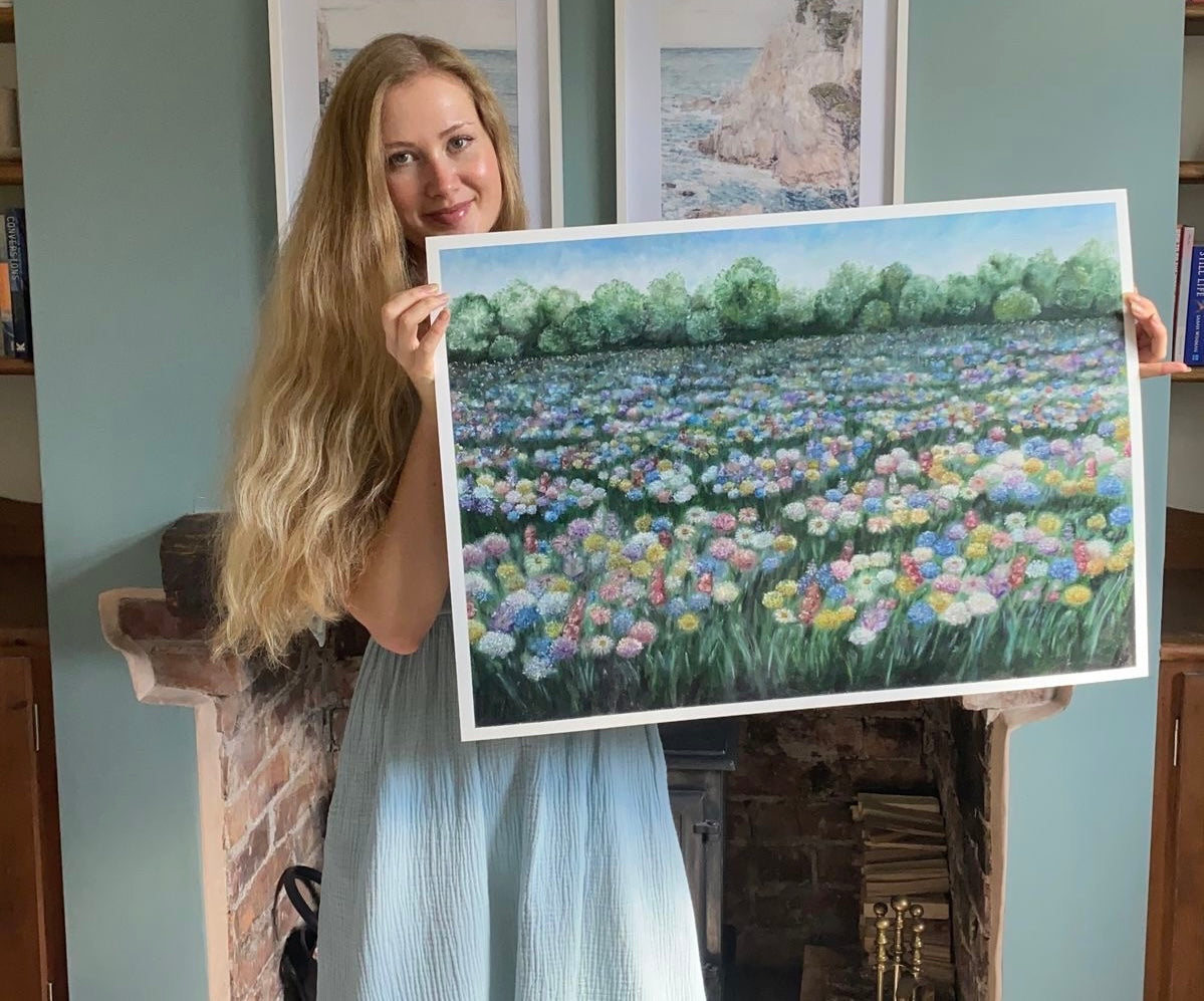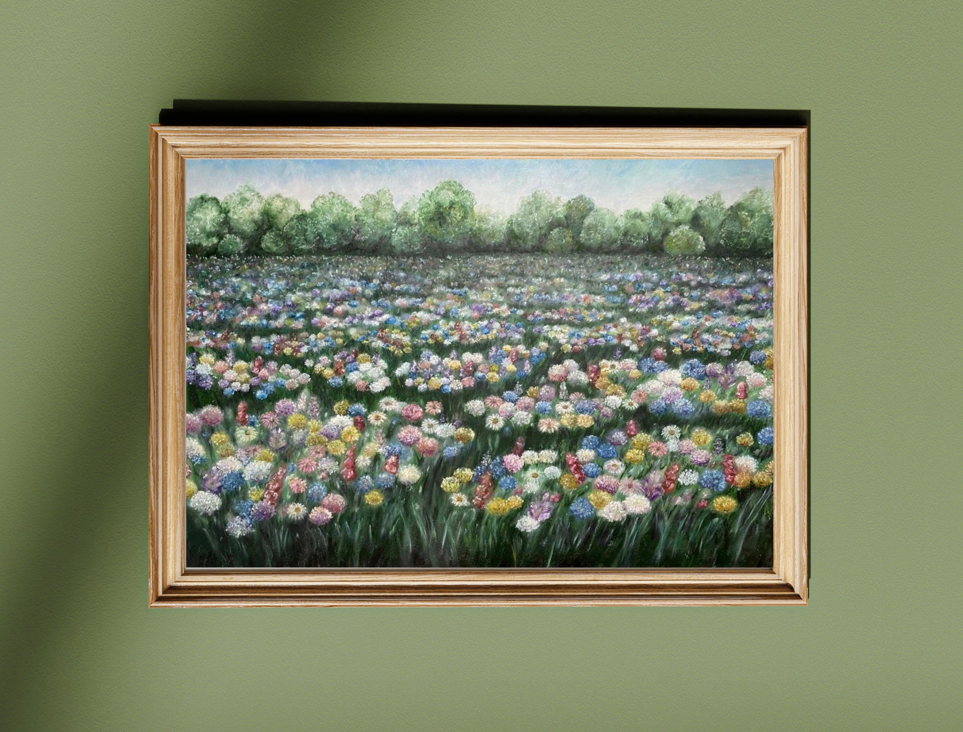 This joyful landscape print features a hand-painted, beautifully detailed print of an ethereal wildflower field painted with oil pastels.