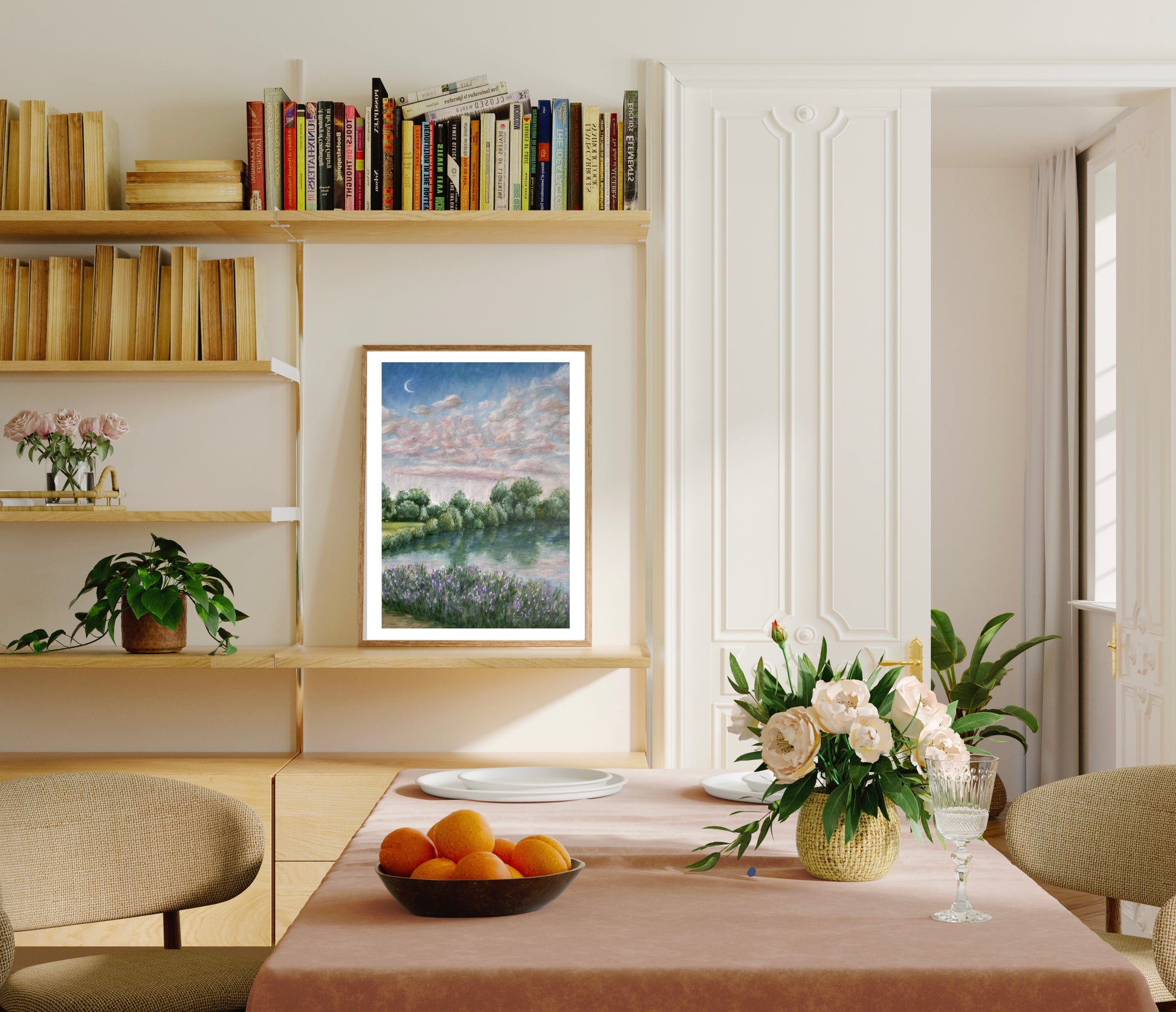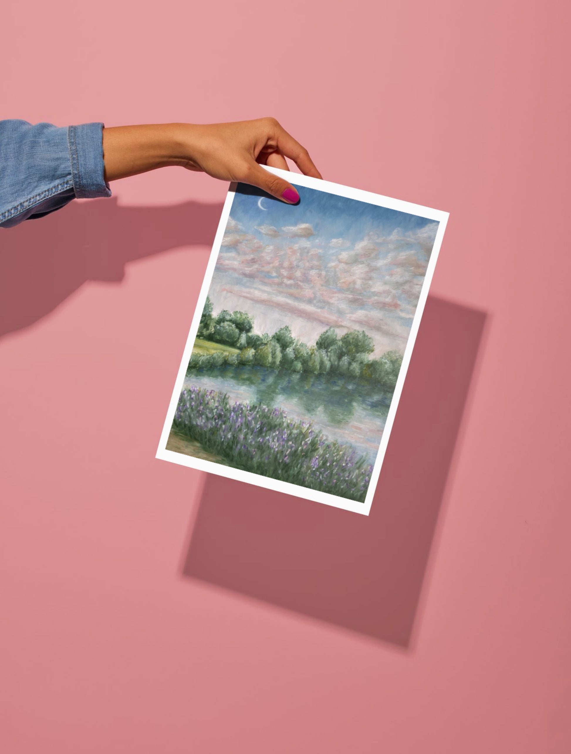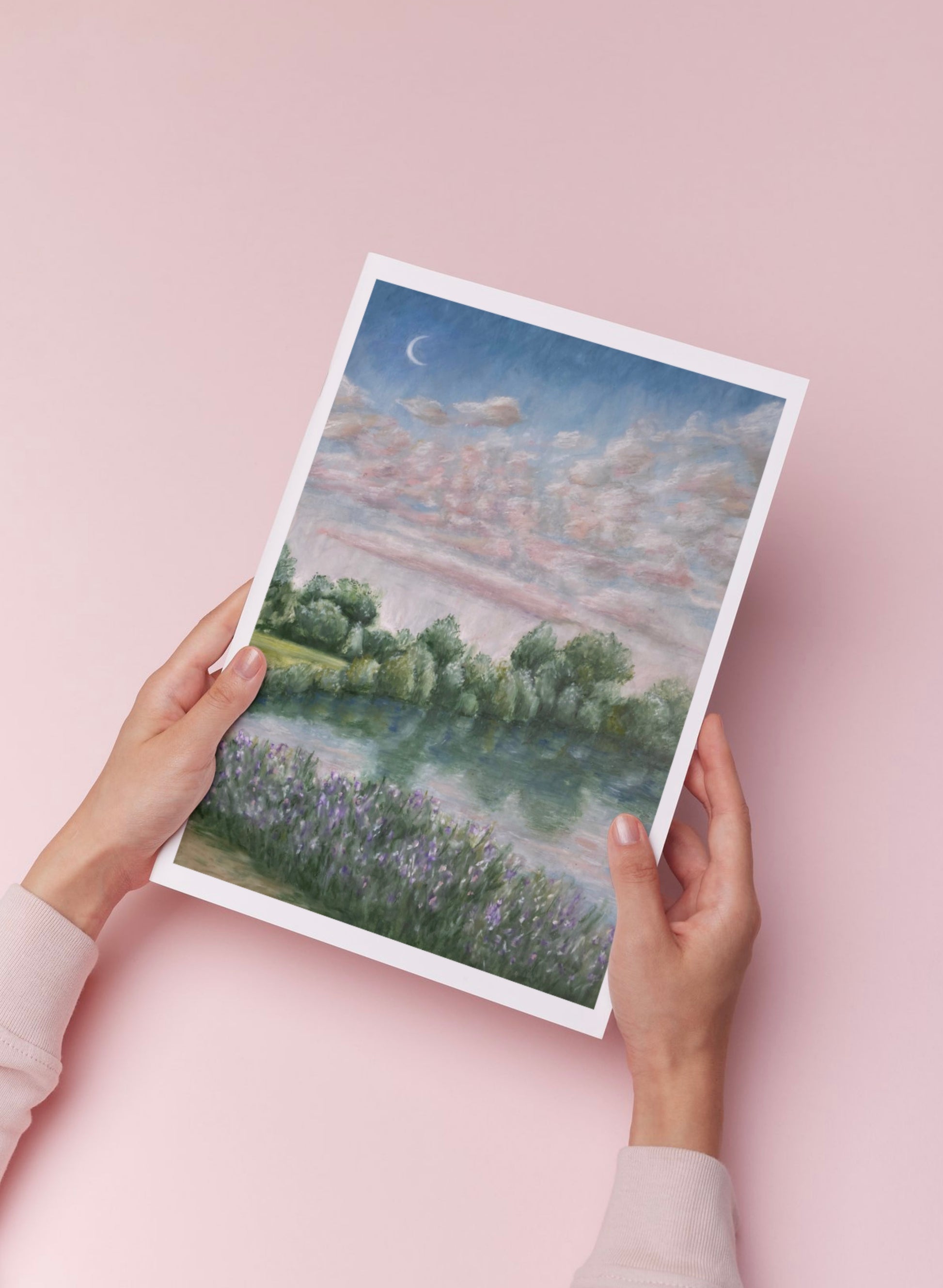 This joyful landscape print features a beautifully-detailed, hand-painted oil pastel painting of a cloudy river scene at dusk.