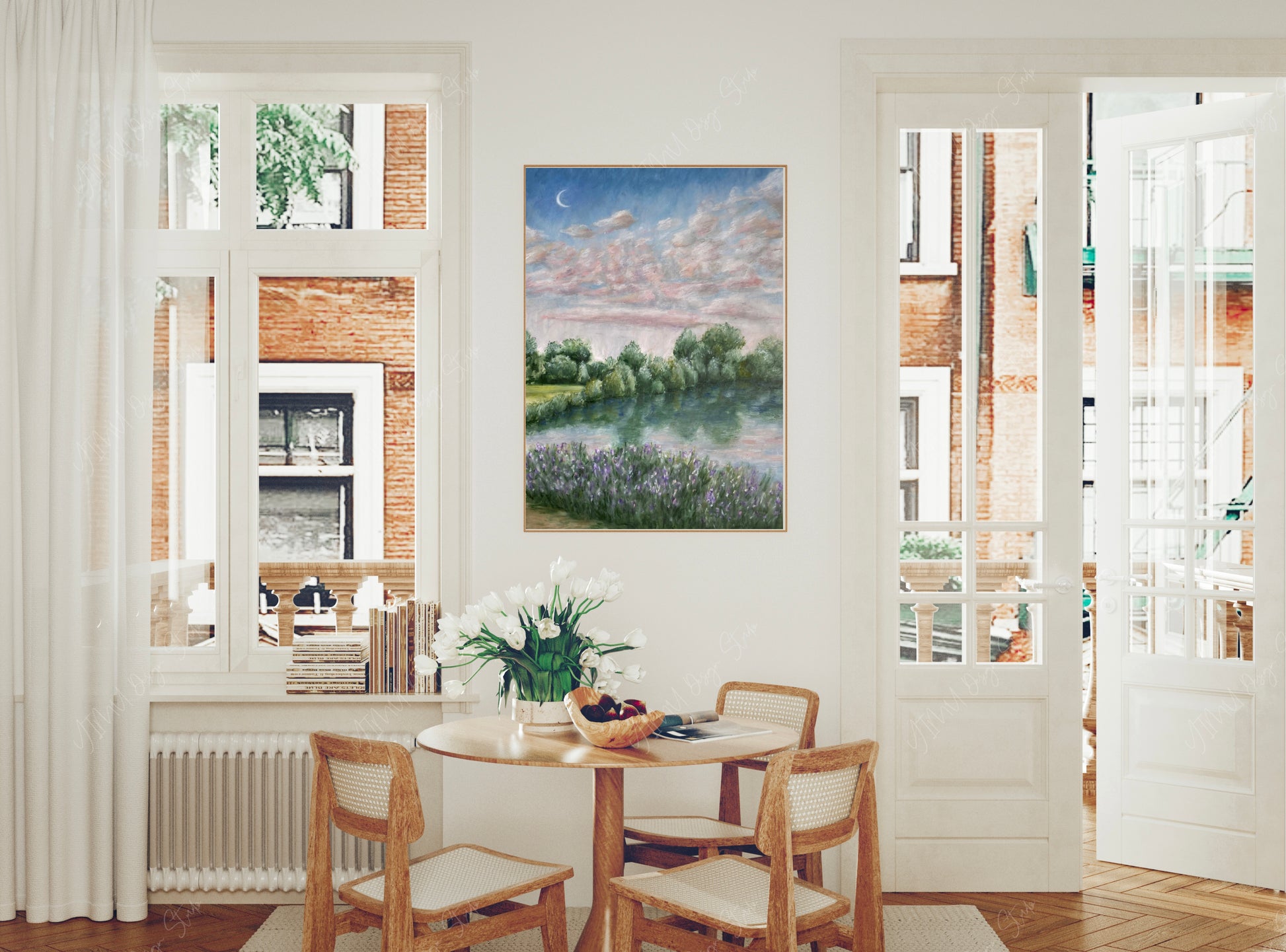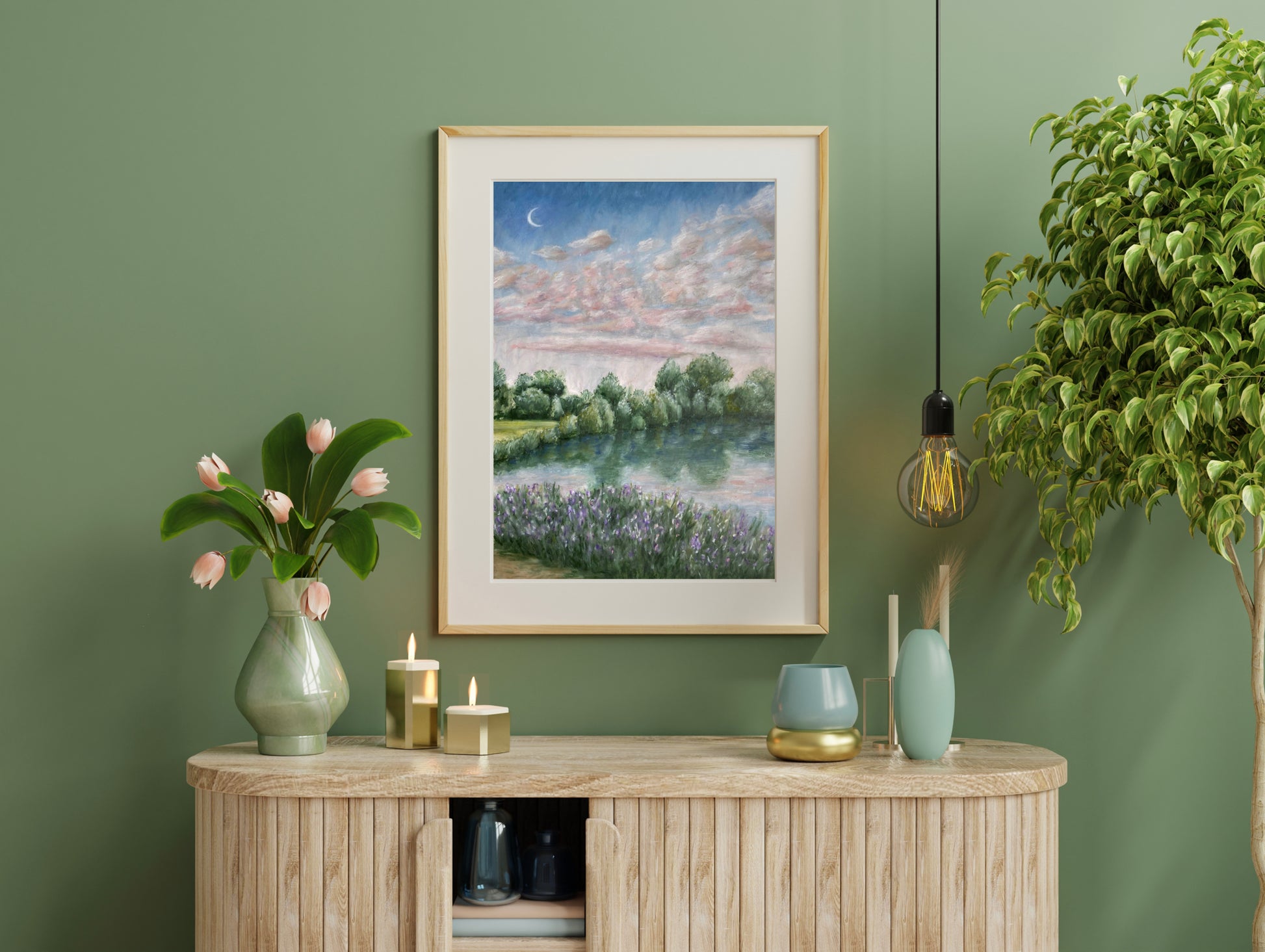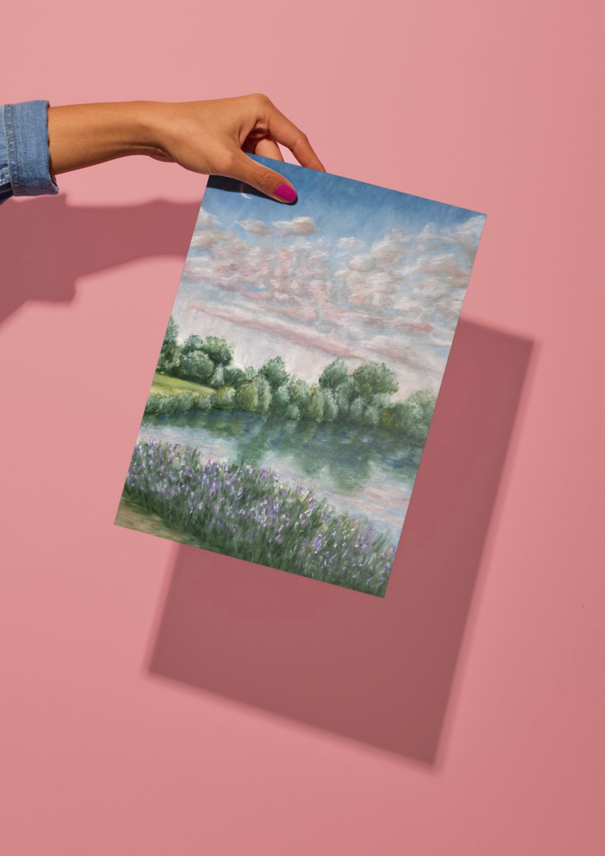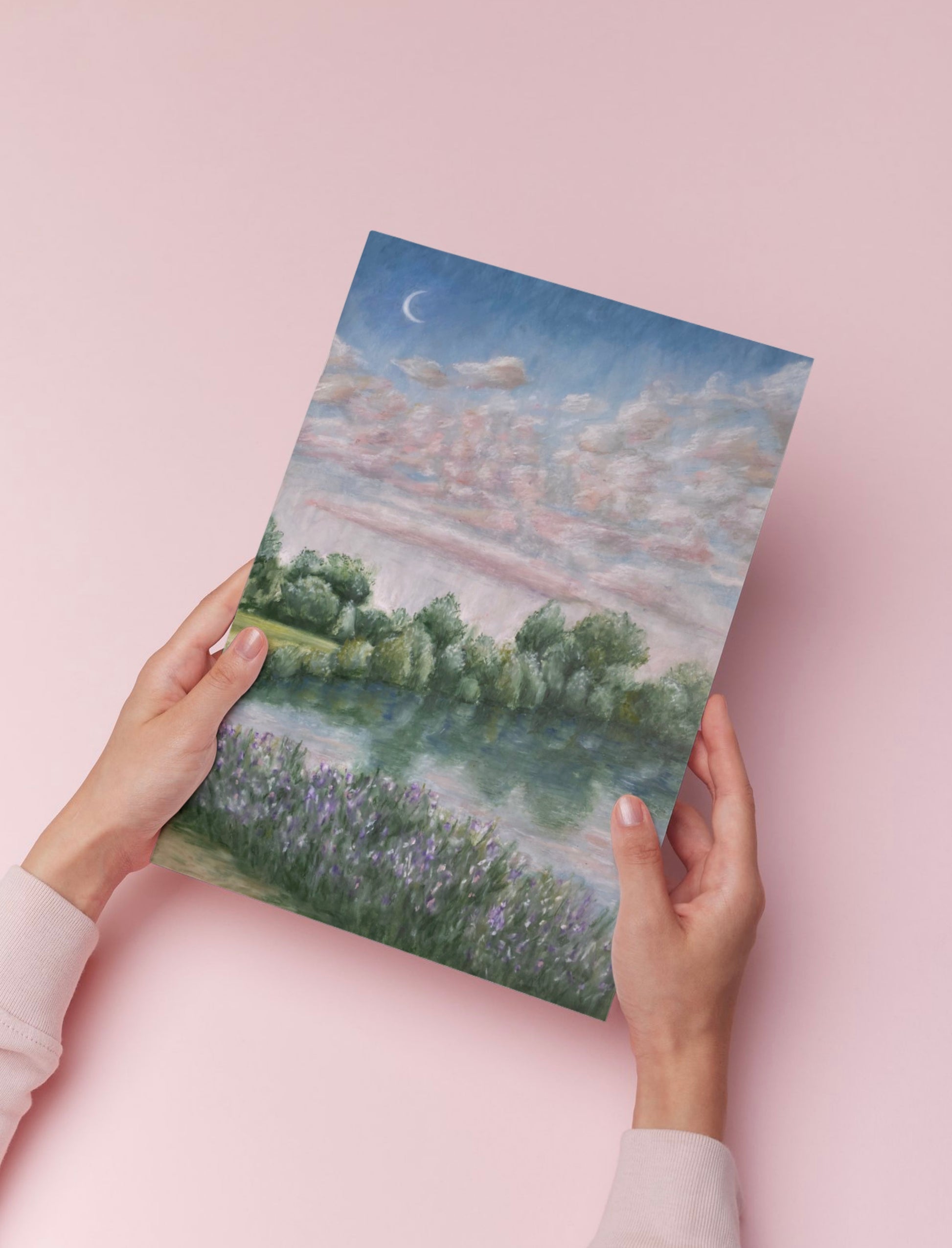 This joyful landscape print features a beautifully-detailed, hand-painted oil pastel painting of a cloudy river scene at dusk.